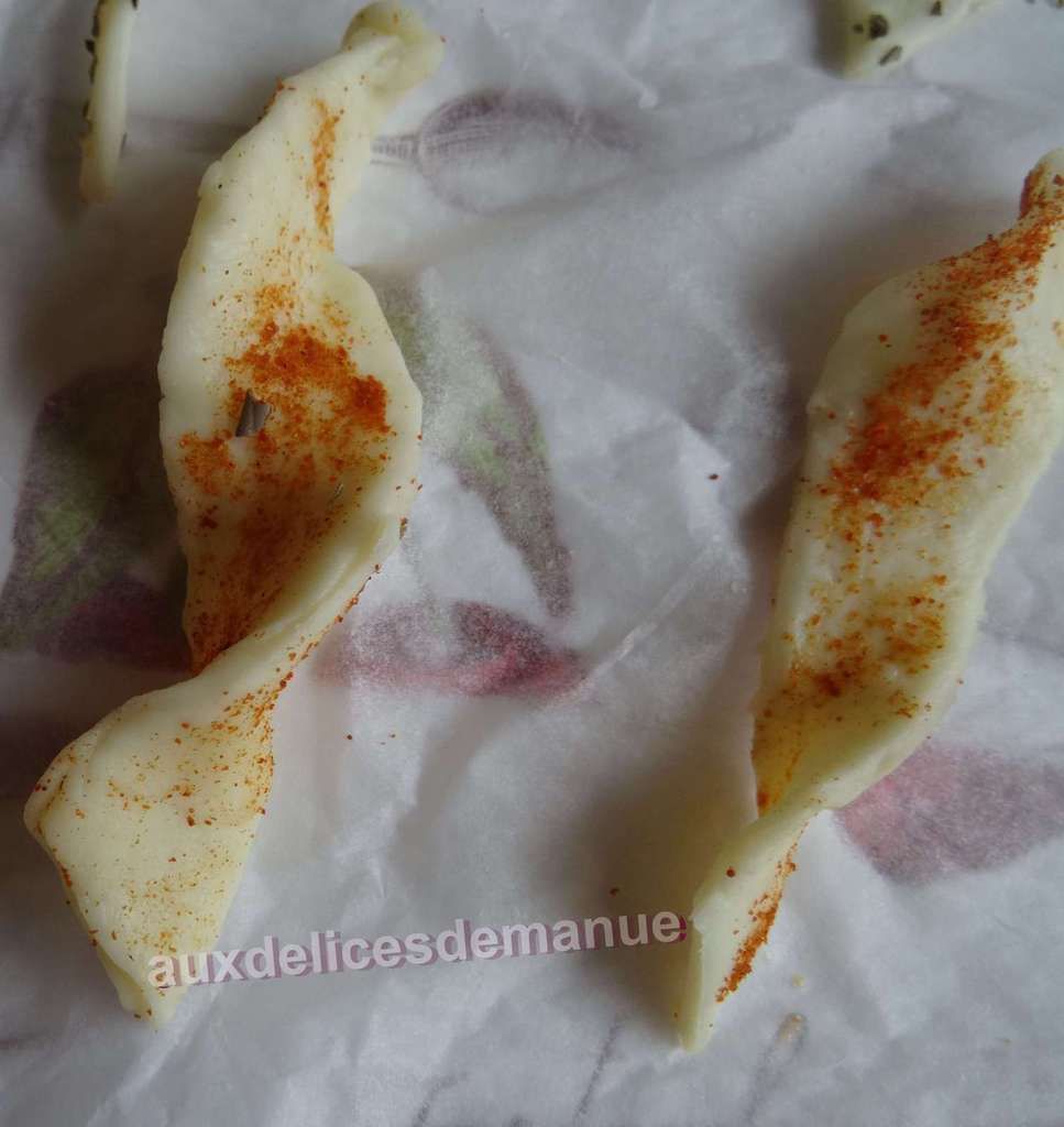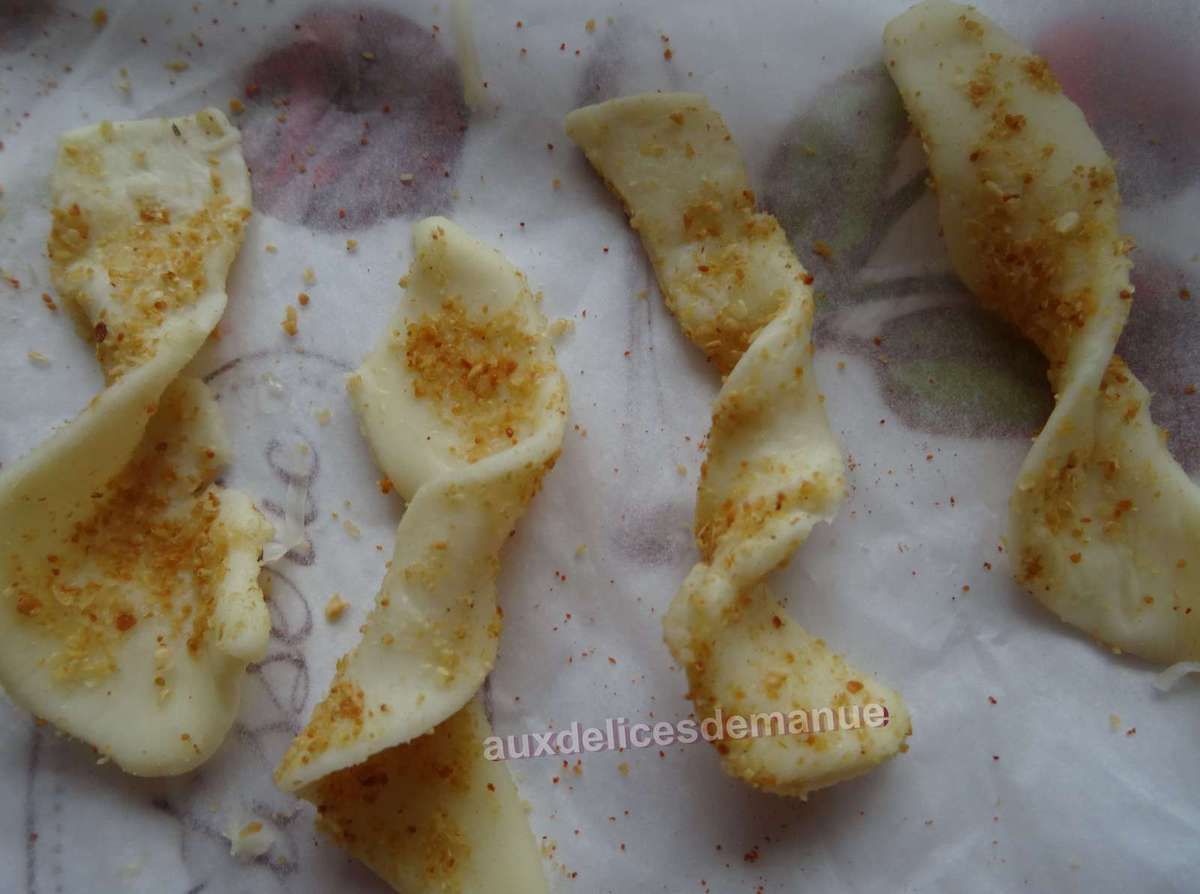 Enduisez les lanières de pâte de chaque côté, puis tournez les pour leur donner une forme, et déposez les sur une plaque recouverte de papier sulfurisé.